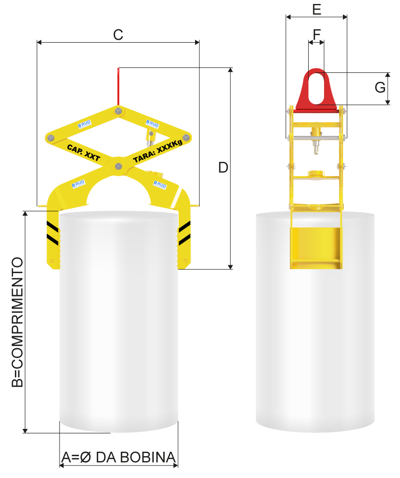 • Aplicação: Indicada para operações industriais de manuseio de bobinas, a tenaz garante praticidade, segurança e eficiência, pois seu sistema mecânico de travamento e destravamento automático elimina a necessidade de contato direto do operador com a carga.