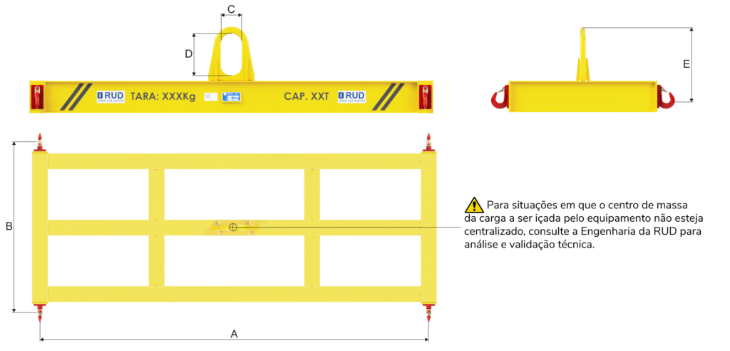 - Aplicação: Sua utilização é indicada para o içamento de cargas longas, sensíveis ou com vários pontos de fixação. O formato retangular permite que as lingas de corrente atuem na vertical, evitando a formação de ângulos e o contato com a carga, o que aumenta a segurança do processo e protege o acabamento da peça do cliente. Além disso, é eficiente para o manuseio de cargas em que o centro de massa esteja deslocado ao longo dos planos longitudinal (Cota A) ou transversal (Cota B), garantindo estabilidade durante toda a movimentação e muito eficiente em galpões com baixo pé-direito.